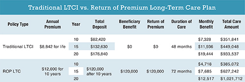 There are many variations of Asset-Based or Leveraged LTC plans. The one I really like is known as the Return of Premium Long-Term Care plan or ROP LTC. The foundation is a universal life insurance policy with a long-term care benefit. Your amount of LTC coverage is determined by your age, the amount you deposit, how long you own the policy before you claim LTC benefits and a couple of other factors.