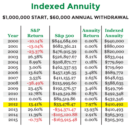 Whereas, our Indexed Annuity, thanks to not having to take any losses, still had $419,492 in 2012 and $305,303 at the end of 2015.