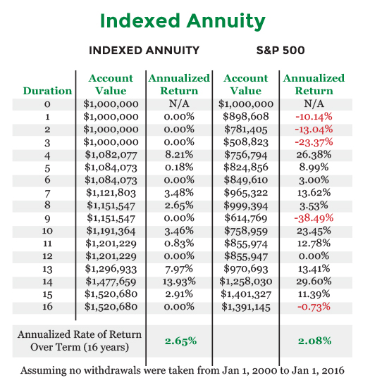 First, I compared the Indexed Annuity assuming no withdrawals were taken from January 1, 2000 to January 2016. Here's how they stacked up: