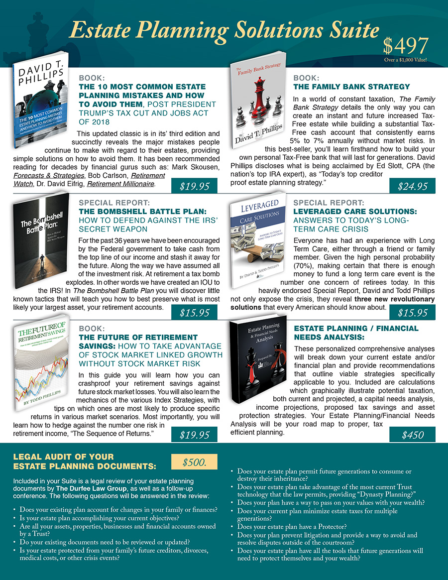 Order your Estate planning Solutions Suite today. Normally over $1,000 when sold separately, this comprehensive package, including the book, Special Reports, your Personalized Estate Planning/Financial Needs Analysis, plus legal audit of your estate planning documents, is very affordable at only $497. Taking advantage of this offer may result in implementing a plan that could save you hundreds of thousands of dollars or more! Questions?? Call us Toll-Free (888) 892-1102 OR ****2020 Update**** There is a NEW form to order this Suite CLICK HERE to Order this Product Today Your First Name (*) Please let us know your name. Your Last Name (*) Invalid Input Street Address Invalid Input City Invalid Input State Invalid Input Zip Code Invalid Input Daytime Phone (*) Invalid Input Best Time To Call Invalid Input Your Email (*) Please let us know your email address. Questions or Comments? Please let us know your message. How did you hear about this strategy? Eagle PublishingDr. Mark Skousen's Forecasts & StrategiesBob Carlson's Retirement WatchDr. David Eifrig's Retirement MillionaireTerry SavageTony SagamiFriend or Family MemberOther Invalid Input Join Newsletter YesNo Invalid Input