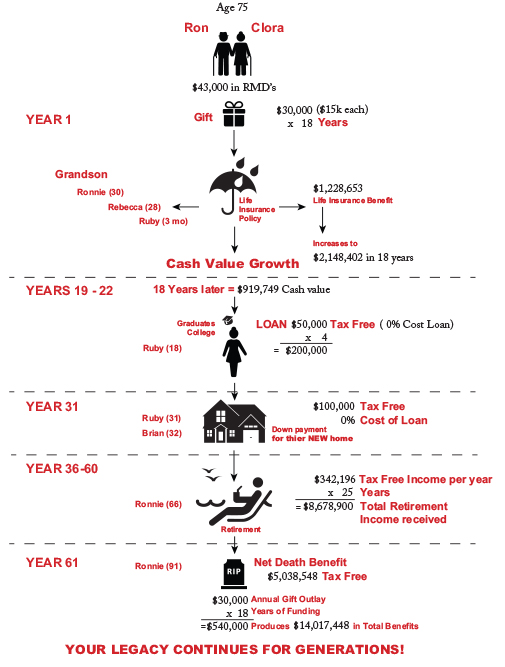 What if Ron and Clora pass away before the 18 years of funding is complete? No problem. Ron and Clora have designated that a small portion of their estate will flow into a trust in the name of Ronnie to make certain that the policy is paid up as planned. An inheritance that he would have received anyway, but this way it will be leveraged into creating millions of dollars for Ronnie and his posterity, who just happens to also be Ron and Clora’s posterity.