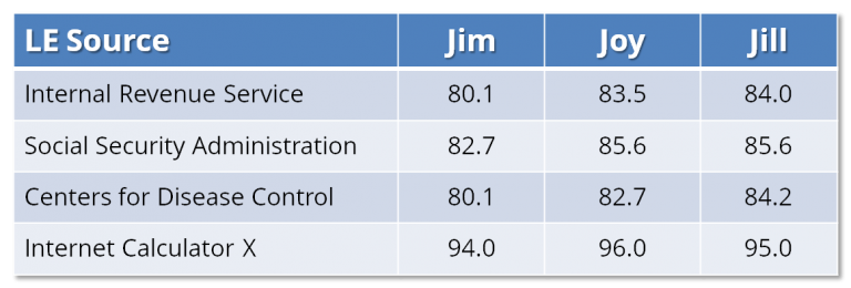 Look at these life expectancy (LE) calculations from various sources. There is significant variation – up to 14 years difference and that can have a huge impact on planning.